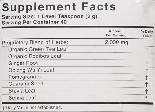 Delicious blend of traditional organic herbs. Blended with Organic Green Tea, Organic Rooibos, Ginger, Oolong Wu Yi, Pomegranate, Guarana, Stevia, Senna, Flavors, Lemon Juice, Sea Salt, Corn, Honey Powder, and Citric Acid.
